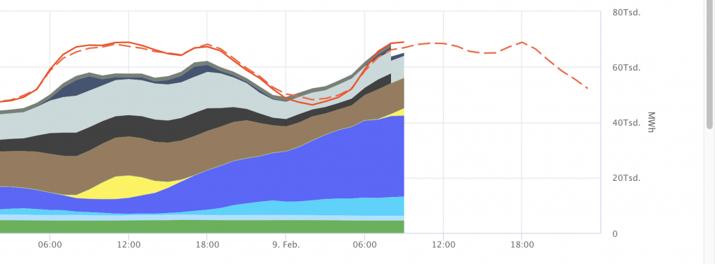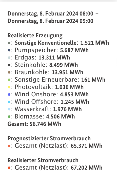 In Zahlen ausgedrückt sieht das folgendermaßen aus: Donnerstagmorgen, produzierte Deutschland zwischen 8 und 9 Uhr nur 56.746 Megawattstunden (MWh) von den 65.371 MWh, die verbraucht wurden. Eine Stromlücke so groß, wie der durchschnittliche Verbrauch von Slowenien.