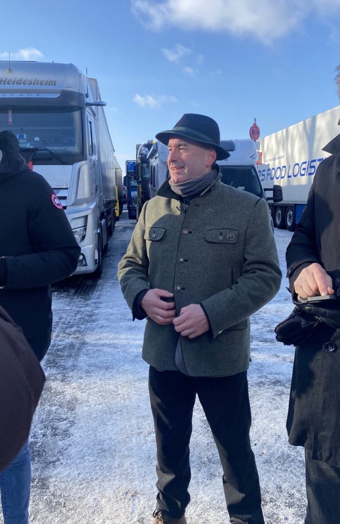 Ganz anders reagierten die Demonstranten auf Hubert Aiwanger (Freie Wähler). „Ihr seit die Helden dieses Landes“, rief Aiwanger den Versammlungsteilnehmern entgegen und erhielt frenetischen Applaus. Als „politische Notwehr“ bezeichnete Aiwanger das Anliegen der LKW-Fahrer, die sich gegen eine Regierung wehren, die das Land „aus Dummheit oder mit Absicht gegen die Wand fahren“ würden. Aiwanger fordert erst ab einem Einkommen von über 2000 Euro Steuern zu erheben. Der Ampel würde es schlicht um das „Abkassieren für ihre ideologischen Träumereien gehen“, so Aiwanger. Am Ende seiner Rede wurde Aiwanger mit „Hubert, Hubert“-Rufen verabschiedet.