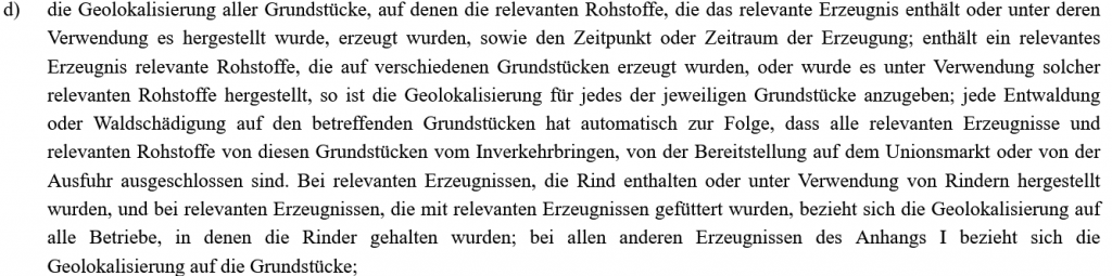 Unter anderem muss das europäische Unternehmen, das ein betroffenes Produkt importiert, die GPS-Daten der Anbaufläche und den Zeitpunkt beziehungsweise den Zeitraum der Erzeugung angeben. Damit kann die eigentlich anonyme Sojabohne auf den Acker der Erzeugung zurückverfolgt werden. Jede Entwaldung beziehungsweise Waldschädigung, die auf einem Grundstück, auf dem die Sojabohne angebaut wird, entsteht, hat zur Folge, dass die Sojabohne nicht mehr nach Europa exportiert werden darf. In der Praxis würde diese dann in ein Land ohne eine solche Regelung exportiert werden.