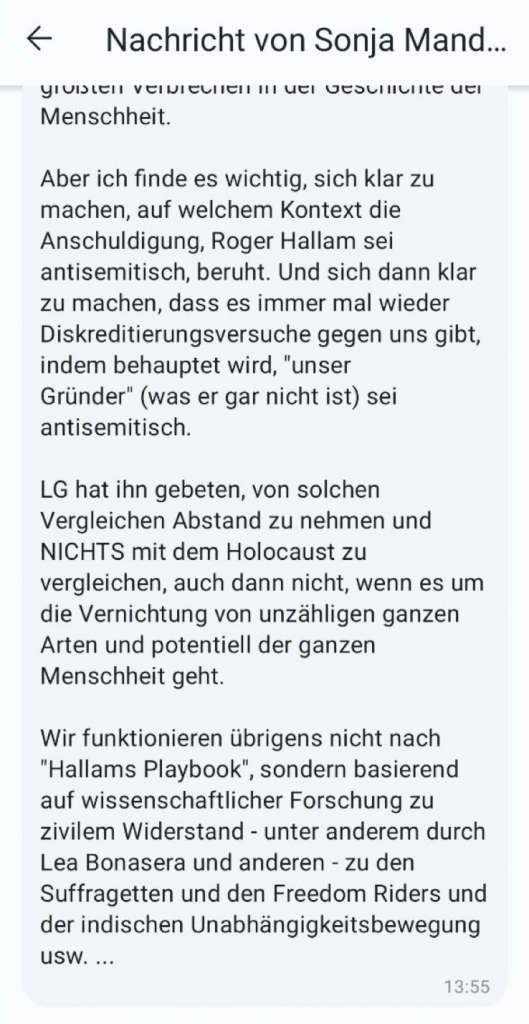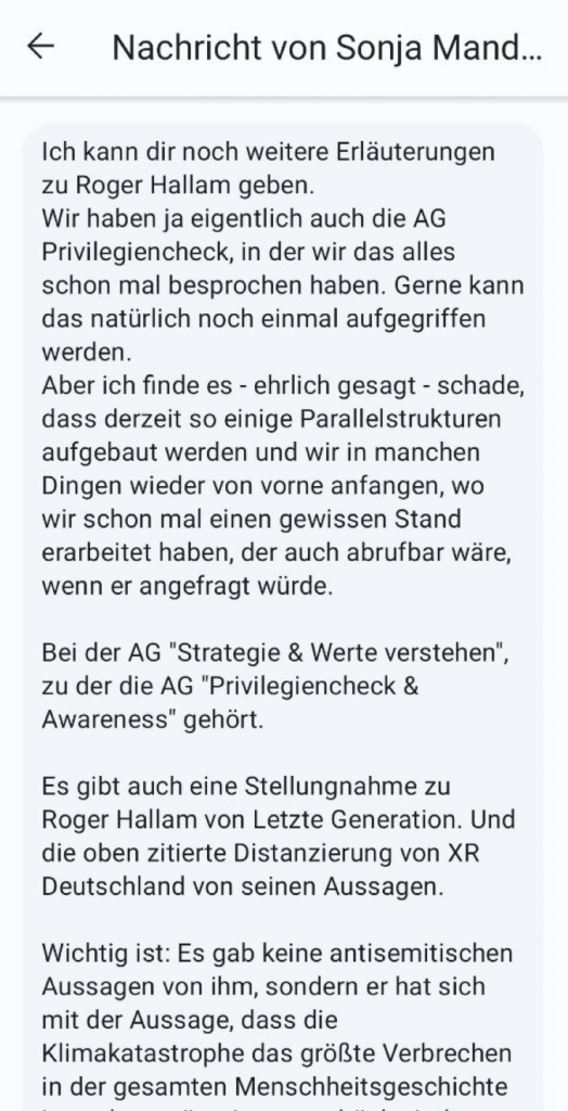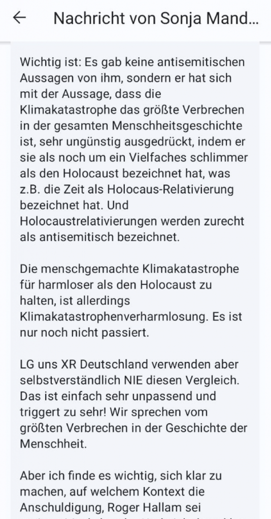 Sonja Manderbach, eine hochrangige Aktivistin der Letzten Generation und ehemalige Direktkandidatin der Linkspartei zur Landtagswahl in Niedersachsen, schrieb in einer internen Chatgruppe, auf die Apollo News zugriff hat, folgendes: „Es gab keine antisemitischen Aussagen von ihm, sondern er hat sich mit der Aussage, dass die Klimakatastrophe das größte Verbrechen der gesamten Menschheitsgeschichte ist, sehr ungünstig ausgedrückt.“