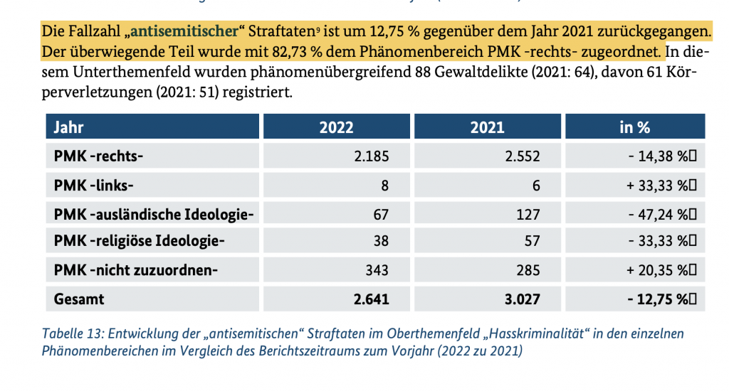 Die Statistik aus dem vergangenen Jahr wurde auch vom eingangs erwähnten ARD-Faktenfinder zitiert. Kein Wunder – die Angaben wirken alarmierend: 82,73 Prozent der antisemitischen Straftaten seien dem Phänomenbereich PMK -rechts- zugeordnet worden, heißt es da. Konkret wurden 2.185 von insgesamt 2.641 antisemitischen Straftaten dem rechten Spektrum zugeordnet, während nur 343 Straftaten in die Kategorie „nicht zuzuordnen“ fielen. Ein ähnliches Bild zeigte sich schon in der Statistik aus 2021, in der 2.552 von 3.027 antisemitischen Straftaten als „rechts“ eingestuft worden waren – und nur 285 als „nicht zuzuordnen“.