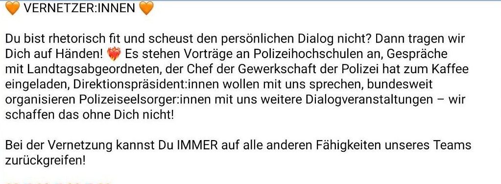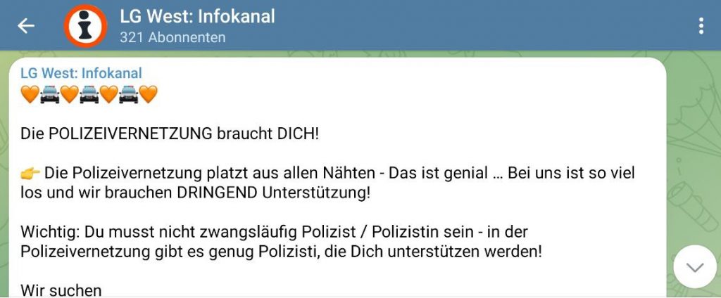 Intern wurde nun von Letzten Generation ein großangelegter Aufruf zur Unterstützung der „Polizeivernetzung“ veröffentlicht. Hinter dem Begriff „Polizeivernetzung“ versammeln sich diverse Mitglieder der „Letzten Generation“, die die Polizei infiltrieren wollen. Welchen Stellenwert und welchen Zufluss die Einflussnahme auf die Polizei wirklich findet, zeigen folgende Zeilen: „Die Polizeivernetzung platzt aus allen Nähten – das ist genial – Bei uns ist so viel los und wir brauchen dringend Unterstützung“.