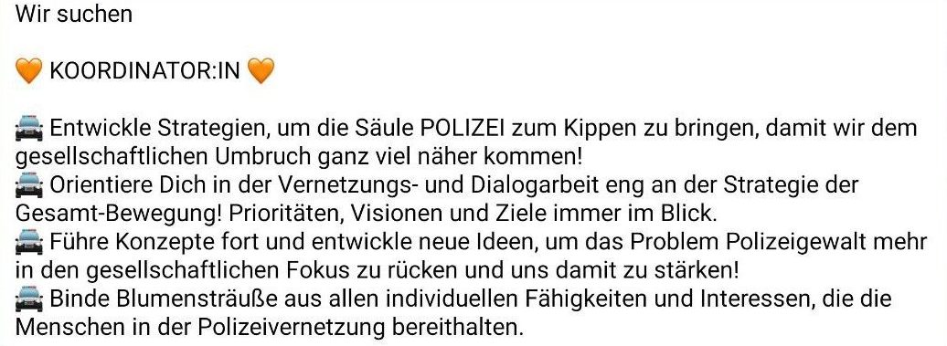 Erklärtes Ziel der sogenannten „Aktivisten“ ist der „gesellschaftliche Umbruch“. Wortwörtlich solle die „Säule Polizei zum Kippen“ gebracht werden. Hierbei gehe es vordergründig nicht einmal um das direkte Einschleusen von Polizisten. Im Gegenteil: „In der Polizeivernetzung gibt es genug Polizisti“, so heißt es in dem Aufruf. Gesucht werden vielmehr „Koordinatoren“, die auf den bereits bestehenden Strukturen aufbauend Strategien entwickeln sollen, um die Polizei zu schwächen. Vordergründig soll hier auch das vermeintliche „Problem Polizeigewalt“ in den gesellschaftlichen Fokus gerückt werden.