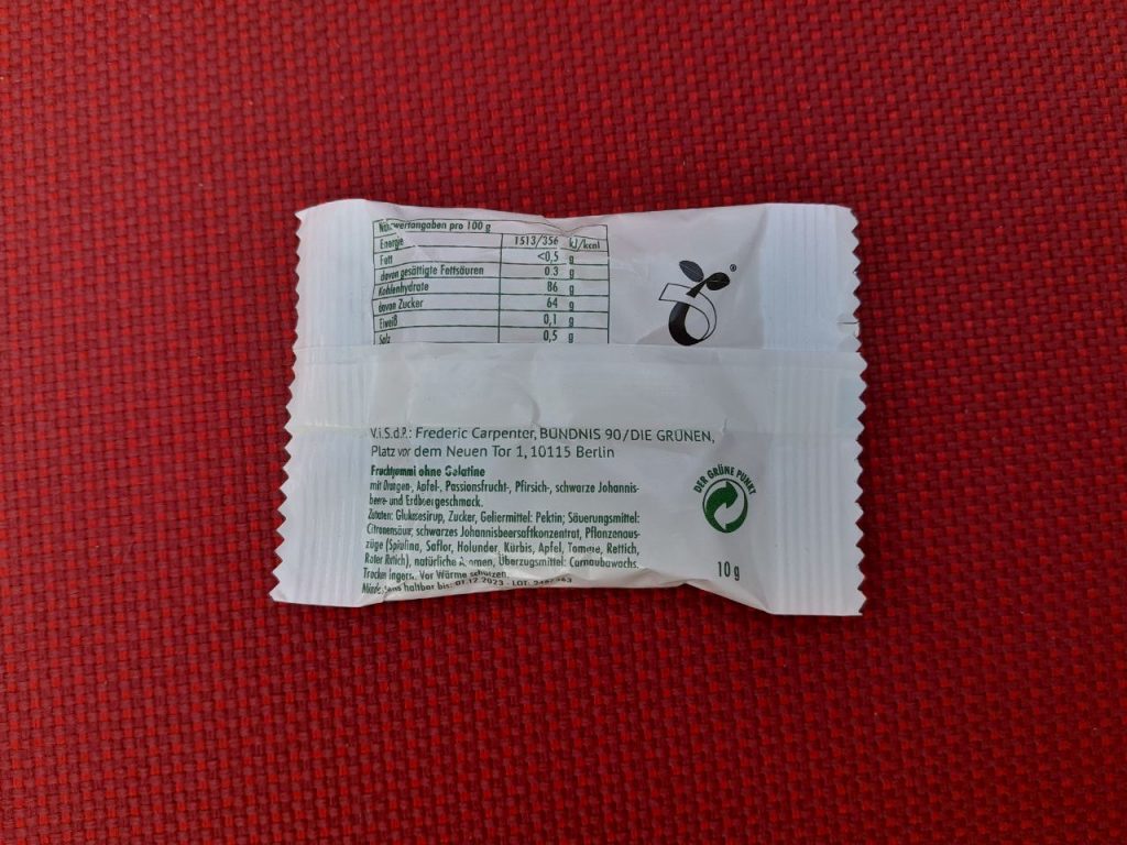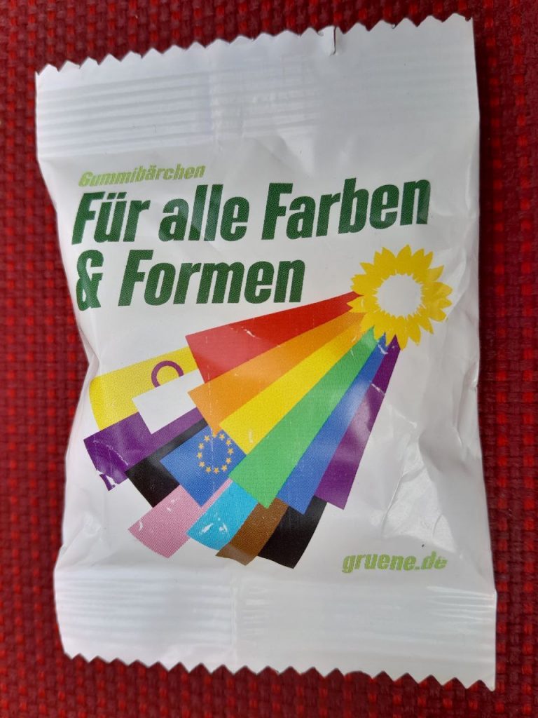 Doch wer jetzt denkt, die Grünen würden angesichts solcher harten Eingriffe in die Marktwirtschaft und Selbstbestimmung der deutschen Bürger zumindest mit einem ‚guten‘ Vorbild vorangehen, der liegt falsch. Ganz im Gegenteil: Statt vermeintlich „gesunde“ Lebensmittel – etwa biologisch angebaute Fairtrade Apfelringe aus besonders CO2-sparender Haltung – an ihren Wahlkampfständen zu verteilen, machen ausgerechnet die Grünen mit Gummibärchen Wahlkampf-Werbung.