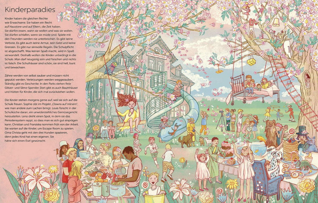 Noch toller wird es nur in der Welt, die sich „Kinderparadies“ nennt. Hier wurden die lästigen Erwachsenen, die uns den Weltuntergang eingebracht haben, einfach gleich entmachtet. Kinder „haben die gleichen Rechte wie Erwachsene“, sie dürfen essen, wann und was sie wollen und sind auch sonst keinen lästigen Regeln unterworfen – „es gibt keine Verbote“.