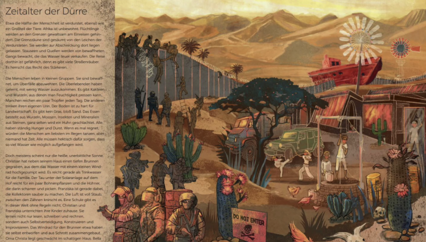 Die Kinderchen könnten sich dann zum Beispiel im „Zeitalter der Dürre“, das zufälligerweise nicht in der Leseprobe enthalten ist, wiederfinden. In dieser düsteren Post-Apokalypse ist „die Hälfte der Menschen“ verdurstet, „ebenso wie ein Großteil der Tiere“. Man sieht ein Bild, in dem die Landschaft nur noch aus Wüste besteht, Menschen in kleinen Gruppen um das Überleben kämpfen und Totenköpfe in der Gegend herumliegen.
