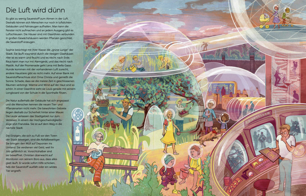 „Die besten Weltuntergänge“ heißt das 32-seitige Buch, das im Jahr 2021 veröffentlicht wurde und Grundschulkindern die „aufregenden Zukunftsbilder“ präsentiert. Damit die Kleinen dabei nicht völlig haltlos sind, durchleben sie das Ende der Welt gemeinsam mit der Familie von Oma Christa, Vater Christian, Mutter Franziska, ihren Kindern Lena, Sophie, Louis und dem Hund Bella. Wie man der Leseprobe des Klett Kinderbuchverlages entnehmen kann, kann man die Familie auf jeder der bunt illustrierten Zukunftsversionen wiederfinden. Zum Beispiel in der post-apokalyptischen Welt „die Luft wird dünn“.