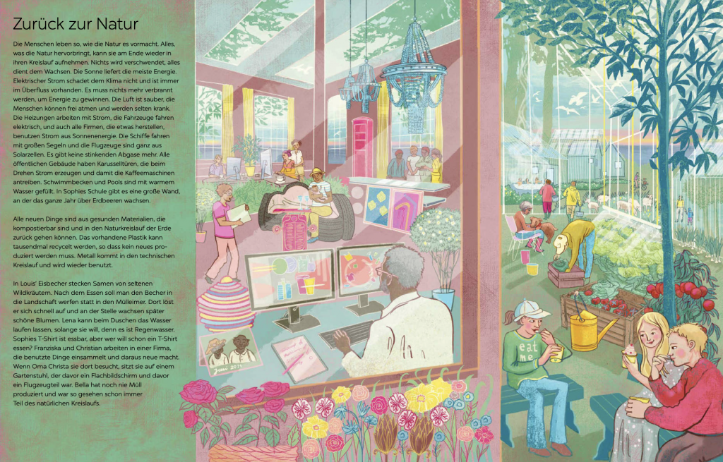 Doch, und das ist wohl die eigentliche Botschaft des Buches, es gibt auch Alternativen zu dieser grausamen Welt voller Tod und staubiger Luft – oder auch zum Leben auf einem Raumschiff. Zum Beispiel in der Utopie „Zurück zur Natur“, in der nichts „verschwendet“ wird. Hier liefert die Sonne „die meiste Energie“, der elektrische Strom „schadet dem Klima nicht und ist immer im Überfluss vorhanden“. Wie das zum Beispiel Nachts oder im Winter funktionieren soll?