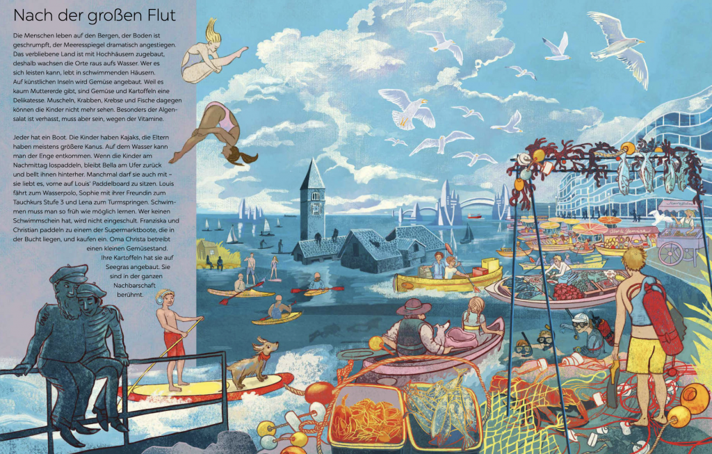 Trotzdem wirkt das Bild recht heiter – ähnlich der Welt „nach der großen Flut“. Die Menschen leben hier „auf den Bergen, der Boden ist geschrumpft, der Meeresspiegel dramatisch angestiegen“. Getreu dem Klima-Märchen, dass bald ganze Länder wie Holland unter Wasser stehen werden, gucken nur noch der Kirchturm und die Häuserdächer aus den Fluten.