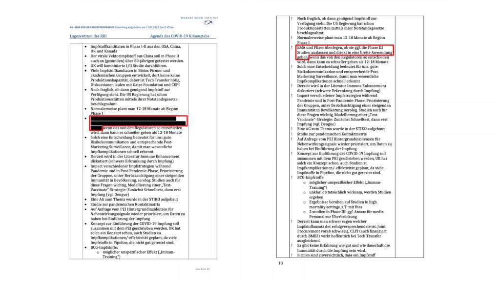 Die kürzlich von einem ehemaligen Mitarbeiter des Robert-Koch-Instituts durchgestochenen Krisenstab-Protokolle sorgen einmal mehr für Aufregung. In den Ergebnisprotokollen der Sitzung vom 15. April 2020 ist vermerkt, dass die Europäische Arzneimittel-Agentur (EMA) und das Pharmaunternehmen Pfizer „überlegen, ob sie ggf. die Phase-III-Studien auslassen und direkt in eine breite Anwendung gehen“.