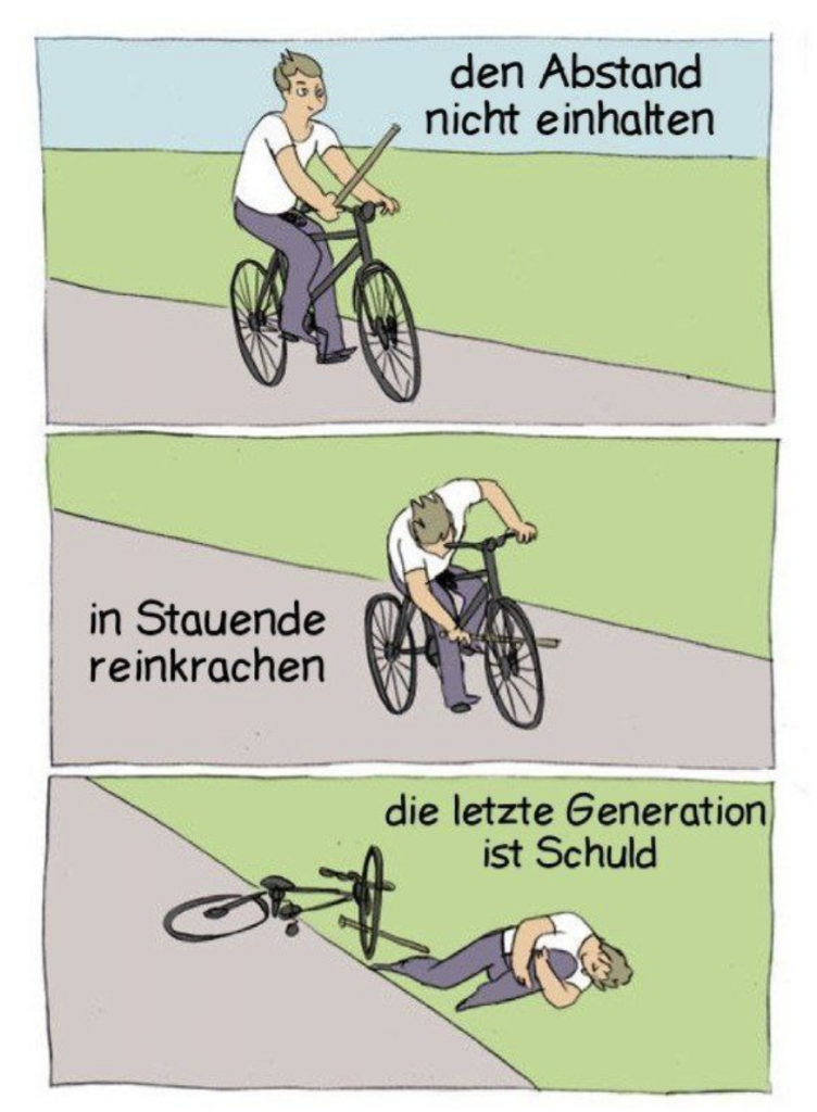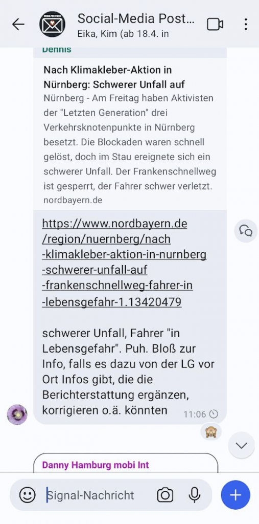 Anstatt die Folgen ihrer eigenen Aktionen zumindest zu reflektieren, schießt sich die Sekte auf das Unfallopfer von Nürnberg ein. Er sei für den Unfall ganz und gar alleine verantwortlich und dürfe nicht so weinerlich sein, suggeriert ein Meme, welches intern die Runde macht. Darauf reagieren Anhänger der „Letzten Generation“ dann noch mit Lach-Smileys oder Flammen-Emojis.