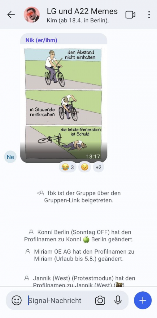 In der Gruppe, in der sich diese Form von Menschenverachtung Bahn bricht, sind nicht nur No-Name-Kleber: Auch Gesichter der „Letzten Generation“, wie Sprecherinnen Aimée van Baalen und Carla Rochel, sind Mitglied des Chats. Es ist ein offizieller Kanal der Gruppe.