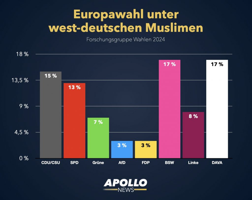 Bei der Europawahl wurden unter west-deutschen Muslimen das von Wagenknecht gegründete BSW und die AKP-nahe, islamische DAVA mit jeweils 17 Prozent stärkste Kraft. Zu diesem Ergebnis kommt eine Untersuchung der Forschungsgruppe Wahlen. Auf Platz drei kommt die Union mit 15 Prozent. SPD und Grüne kommen nur auf 13 beziehungsweise 7 Prozent. Die Linke kommt auf 8 Prozent, AfD und FDP jeweils auf 3 Prozent. Insgesamt zeigt sich eine starke Abweichung zwischen dem Europawahlergebnis unter Muslimen und dem Gesamtergebnis der Europawahl in Deutschland, bei der die Union mit 30 Prozent vor der AfD (15,9 Prozent) stärkste Kraft wurde.