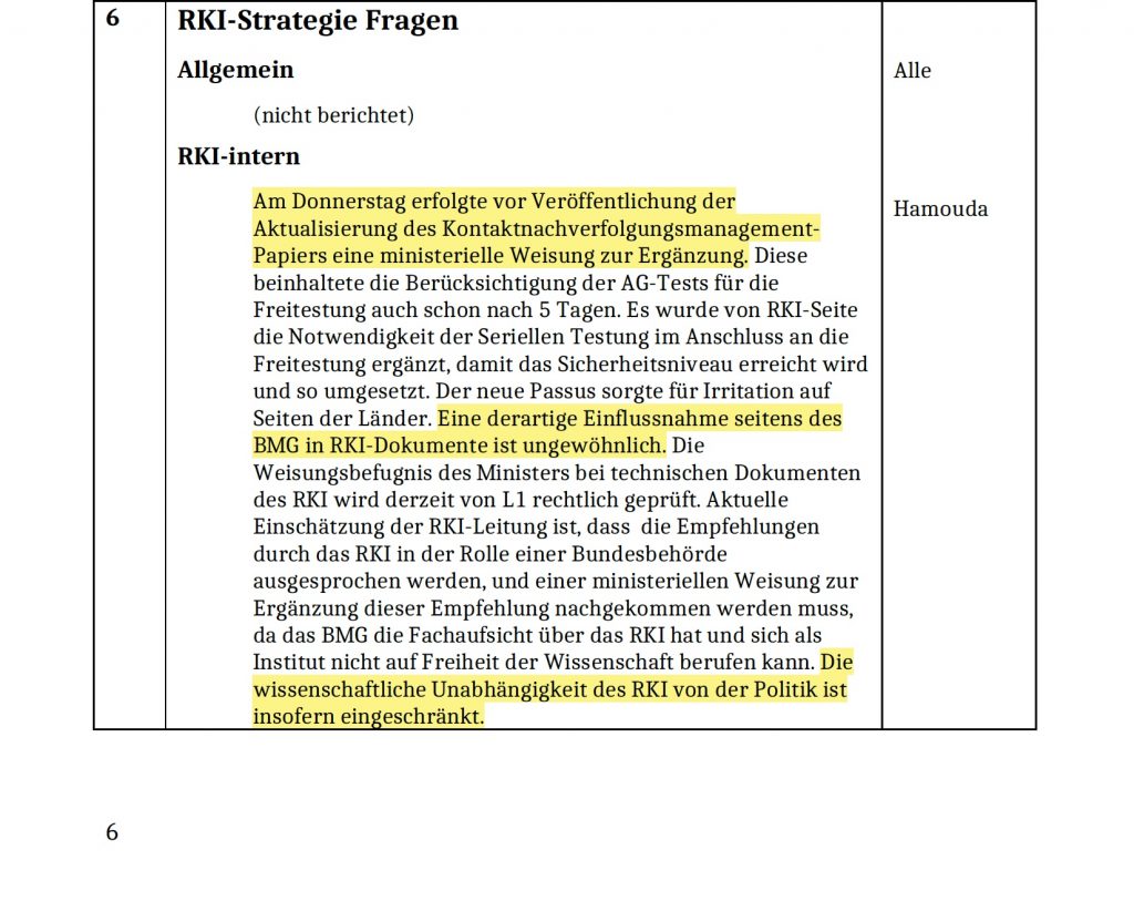 Ein weiteres Protokoll belegt die politische Vereinnahmung der untergeordneten Behörde des Bundesgesundheitsministeriums und dem damaligen Minister Jens Spahn: Das Protokoll vom 10.09.2021 beschreibt, wie das RKI eine „ministerielle Weisung zur Ergänzung“ erhielt. Es ging um ein RKI-internes Papier über Kontaktnachverfolgung und das Management dahinter. Das RKI empfahl zu diesem Zeitpunkt, dass sich die Bürger für eine Freitestung aus der Quarantäne mehreren Antigen-Tests („AG-Tests“) unterziehen, dem Bundesgesundheitsministerium reichte eine Freitestung nach fünf Tagen.