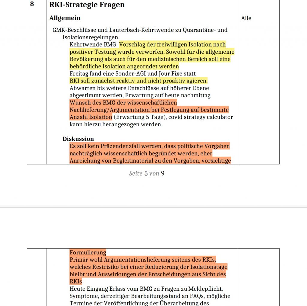 Auch sollte das RKI dazu „nicht proaktiv agieren“, sondern reagieren – Karl Lauterbach gibt das Tempo an. Doch um diese willkürliche Isolationsanordnung, die nicht von der Wissenschaft gestützt war, in der politischen Kommunikation zu bestärken, sollte das RKI eine wissenschaftliche Argumentation nachliefern. Weiterhin „soll kein Präzedenzfall“ geschaffen werden, „dass politische Vorgehen nachträglich wissenschaftlich begründet werden.“ Es soll „vorsichtig“ formuliert werden und lediglich „Begleitmaterial zu den Vorgaben“ bereitgestellt werden.