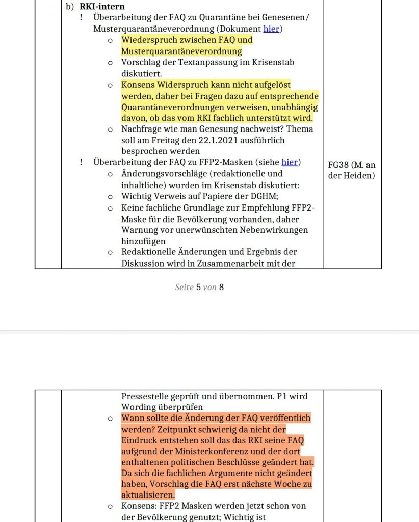 Das Protokoll belegt, dass „Widerspruch nicht aufgelöst werden kann“ – das RKI bleibe inhaltlich also bei der eigenen Einschätzung. Bei entsprechenden Presseanfragen zu den Widersprüchen soll weiterhin auf die Quarantäneverordnung verwiesen werden. Damit die inhaltlich verschiedenen Positionen des RKI und der Bundesregierung nicht dauerhaft Fragen aufwerfen – oder möglicherweise die fachliche Entkoppelung der Bundesregierung und insbesondere des Bundesgesundheitsministeriums offenbaren – muss das FAQ auf der Website geändert werden. Doch der Zeitpunkt der Änderung sei „schwierig“.