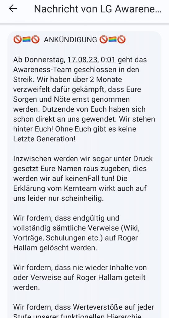 Und weiter: „Das Awarness Team der Letzten Generation geht deswegen ab dem 17.08 um 0:01 geschlossen in den Streik.“ Man erklärt: „Wir haben über 2 Monate verzweifelt dafür gekämpft, dass Eure Sorgen und Nöte ernst genommen werden. Dutzende von Euch haben sich schon direkt an uns gewendet. Wir stehen hinter Euch! Ohne Euch gibt es keine Letzte Generation!“