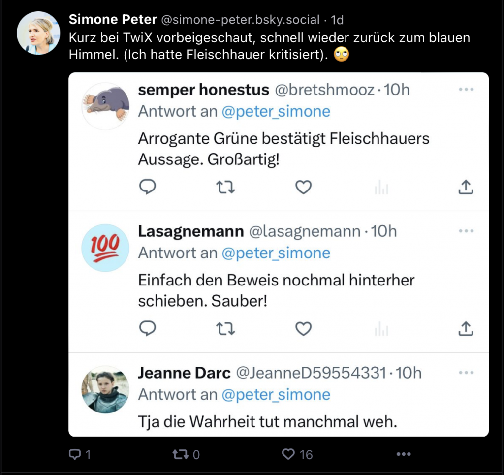 Die „Kritik“, die Peter geübt hatte, sah so aus: Der Kolumnist Jan Fleischhauer hatte die Art und Weise der Grünen kritisiert, als belehrende Übermenschen aufzutreten. „Wenn der Grüne den Raum betritt, dann betritt die Aufklärung den Raum“, meinte er ironisch. Peter kommentierte: „Schwachsinn!“ Und produzierte damit die gezeigten Reaktionen. Pöbelei bleibt nicht unwidersprochen – schnell wieder zurück in den blauen Himmel!