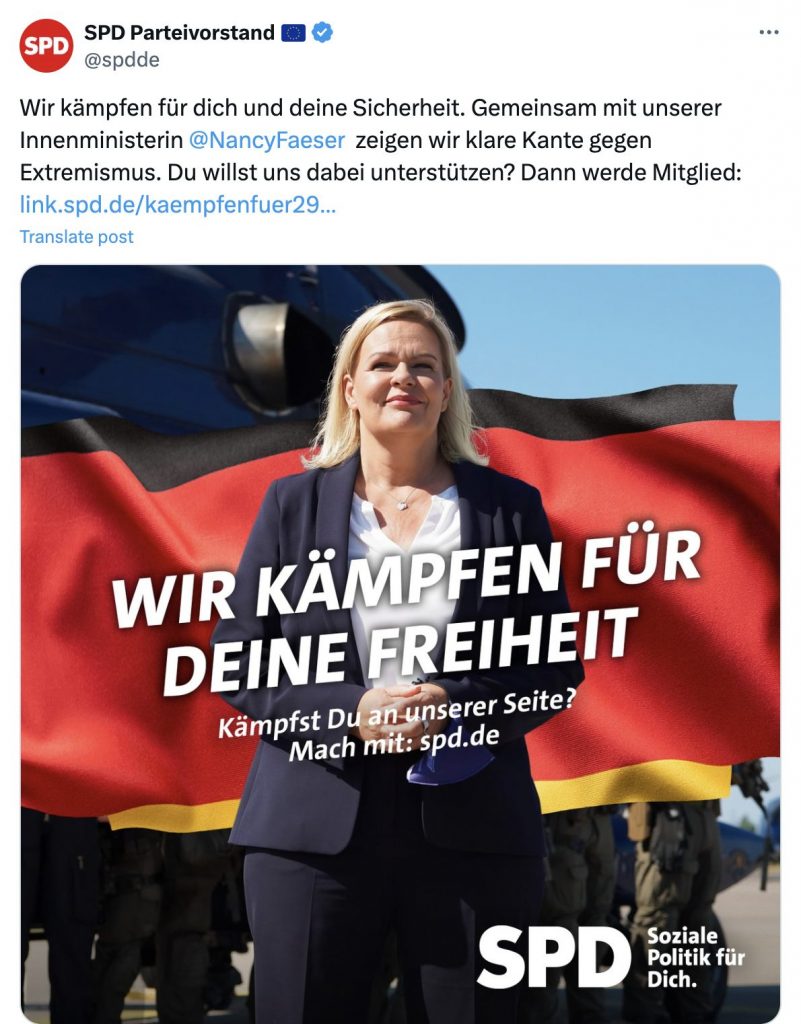 Im Zuge ihrer neuen Wahlkampagne wirbt die SPD nun auch mit der Bundesinnenministerin Faeser. Ironischerweise soll gerade die Innenministerin für die Freiheit „kämpfen“. Auf X (vormals Twitter) erklärten die Sozialdemokraten, dass man „für dich und deine Sicherheit“ kämpfen würde. Mit Innenministerin Faeser würde man „klare Kante gegen Extremismus“ zeigen.