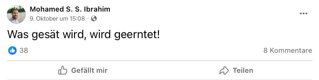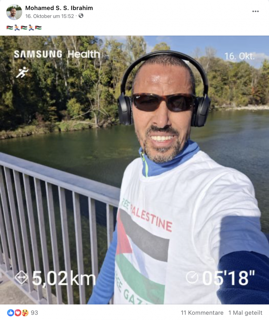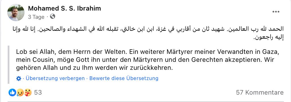 Und nicht nur das: Auch nach dem 7. Oktober rechtfertigte Ibrahim den Terror. „Was gesät wird, wird geerntet!“, postete er zum Beispiel nur drei Tage nach dem Überfall auf Israel auf Facebook. Vor kurzem feierte er den Tod seines Cousins als „Märtyrer“ im Gazastreifen.