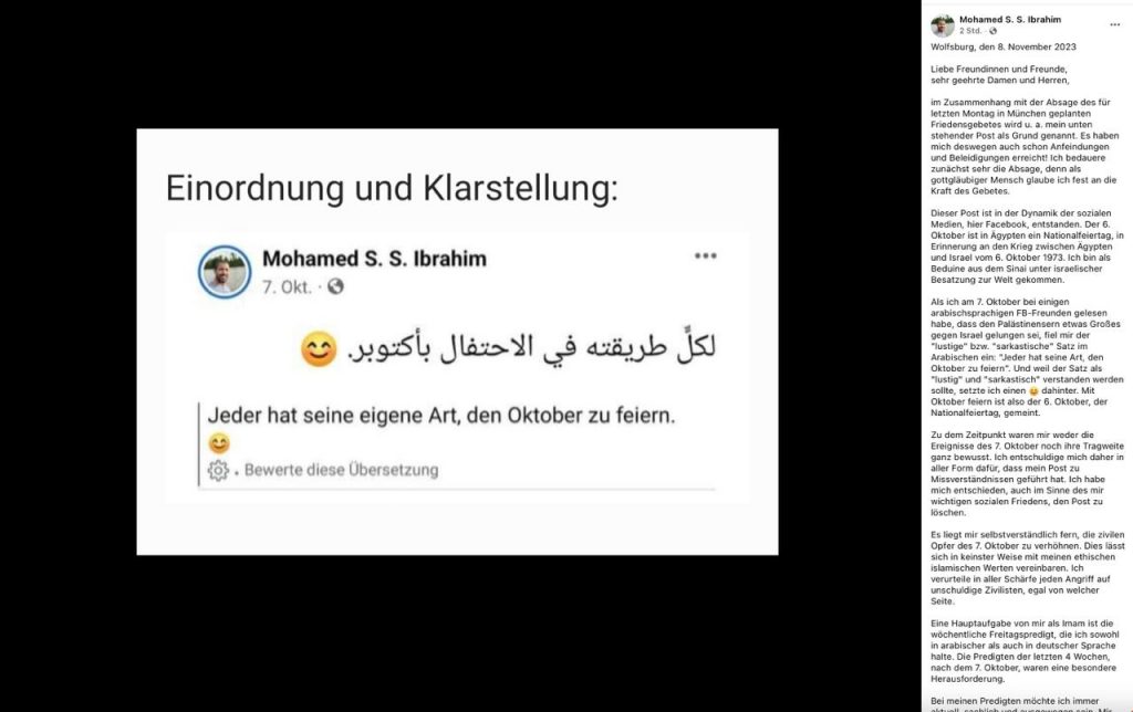 Ibrahim entschuldigt sich für „potenzielle Missverständnisse“ aufgrund seines Facebook-Posts – er habe angeblich nur positiv auf den ägyptischen Nationalfeiertag Bezug genommen, der einen Tag vorher stattgefunden hatte. Als er am 7. Oktober „bei einigen arabischsprachigen FB-Freunden gelesen habe, dass den Palästinensern etwas Großes gegen Israel gelungen sei“, fiel Ibrahim nach eigenen Aussagen der „lustige“ bzw. „sarkastische“ Satz im Arabischen ein.
