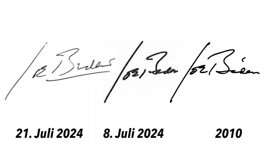 Ich hätte da noch eine andere Idee, weshalb die Unterschrift völlig anders ist: „Joe Biden“ ist gar nicht (mehr) Joe Biden…