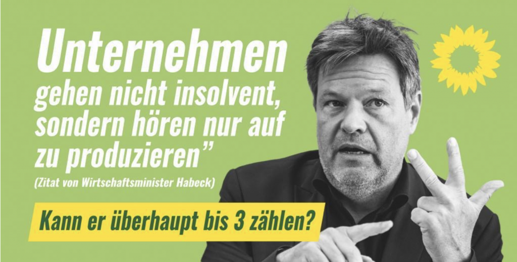 Bundeswirtschaftsminister Robert Habeck wird auch auf der zweiten Tafel ins Visier genommen und trägt ein weiteres Zitat des ehemaligen Kinderbuchautors: „Unternehmen gehen nicht insolvent, sondern hören nur auf zu produzieren.“ Die Ersteller der Tafeln fügten sarkastisch hinzu: „Kann er überhaupt bis drei zählen?“ Zu sehen ist Habeck, wie er drei Finger hochhält. Die Gestaltung erinnert an ein Wahlkampfplakat der Grünen.