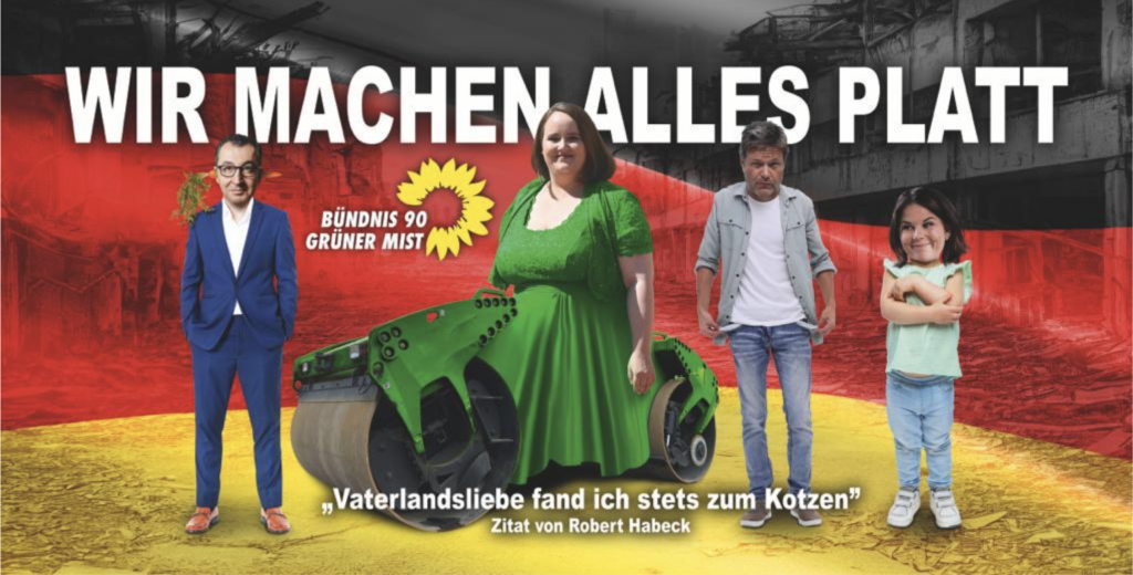 Eine Werbetafel zeigt neben den Grünen-Politikern Cem Özdemir, Robert Habeck und Annalena Baerbock auch Ricarda Lang – und zwar auf einer Dampfwalze. Die Tafel trägt die Aufschrift „Wir machen alles Platt“. Im Hintergrund sieht man zerstörte Straßen und eine Deutschland-Fahne. Die Darstellung wird mit einem älteren Zitat von Habeck abgerundet: „Vaterlandsliebe fand ich stets zum Kotzen“ und stammt aus seinem 2010 erschienen Buch „Patriotismus. Ein linkes Plädoyer“.