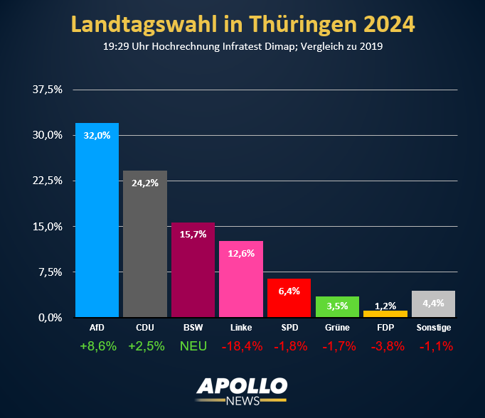 Die Linke bricht zusammen: 2019 gewann Ramelow noch mit 31 Prozent klar die Thüringer Landtagswahl. Seitdem ist viel passiert – eine unpopuläre Minderheitsregierung und das Zusammen- und Auseinanderbrechen der Linken im ganzen Land haben Ramelows Position nicht gestärkt. Das Bündnis Sahra Wagenknecht hat ihm jetzt den politischen Todesstoß versetzt. Die Linken-Abspaltung BSW zieht jetzt 15,8 Prozent, die Linke kommt so nur noch auf 12,4 Prozent. Das heißt: Auch zusammengerechnet kommen die beiden Linksparteien knapp unter das Ergebnis von 2019.