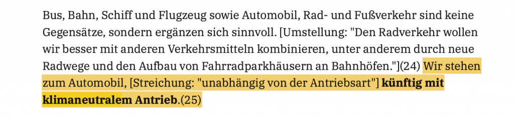 Des Weiteren wird im Antrag eine Abkehr vom Bekenntnis zum Verbrennermotor gefordert. Im Entwurf des Grundsatzprogramms heißt es bisher: „Wir stehen zum Automobil, unabhängig von der Antriebsart“. Die KU fordert nun den Satz so zu verändern, dass die CDU nur noch zum Auto steht, wenn es „künftig mit klimaneutralem Antrieb“ fährt.
