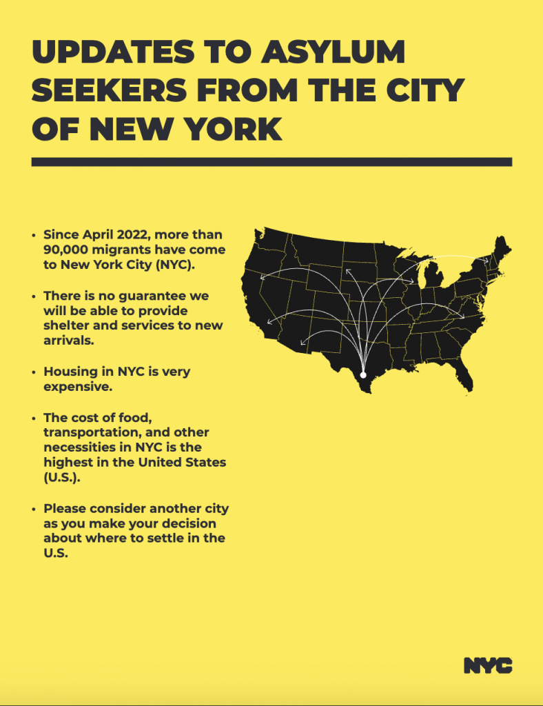 Demnach will New York nun spezielle Flyer an Migranten austeilen, darin heißt es: „Seit April 2022 sind mehr als 90.000 Migranten nach New York City gekommen. Es gibt keine Garantie dafür, dass wir Neuankömmlingen Unterkunft und Dienstleistungen bieten können.“