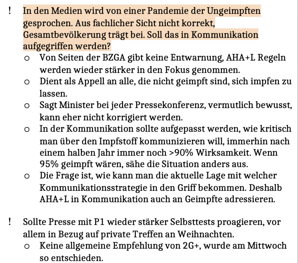 Wie aus diesen Dokumenten nun unter anderem hervorgeht, hat eine „Pandemie der Ungeimpften“ nie stattgefunden. In dem Protokoll vom 5. November 2021 heißt es: „In den Medien wird von einer Pandemie der Ungeimpften gesprochen. Aus fachlicher Sicht ist das nicht korrekt“. Vielmehr trage die „Gesamtbevölkerung“ zum Pandemiegeschehen bei. Weiter fragt man sich an jenem Tag beim RKI: „Soll das in Kommunikation aufgegriffen werden?“
