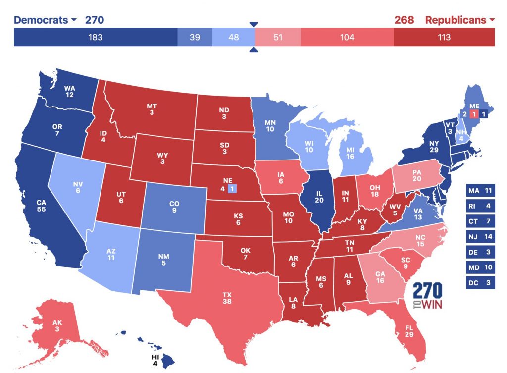 Die Swing States sind dabei praktisch gleich geblieben: Dies sind weiterhin die „Rustbelt“-Staaten Wisconsin, Michigan, Pennsylvania und die „Sunbelt“-Staaten Nevada, Arizona, Georgia und North Carolina. Um die Präsidentschaft zu gewinnen, muss ein Kandidat 270 der 538 Wahlmännerstimmen gewinnen. Genau diese 270 würde Trump bereits erreichen, wenn er im „Rustbelt“ lediglich Pennsylvania gewinnt und im Süden Georgia und North Carolina – auch wenn er das bisher wichtige Arizona und zusätzlich noch den Wüstenstaat Nevada verliert. Bei der vergangenen Wahlmännerzuteilung hätte im gleichen Ausgang noch Biden knapp gewonnen.