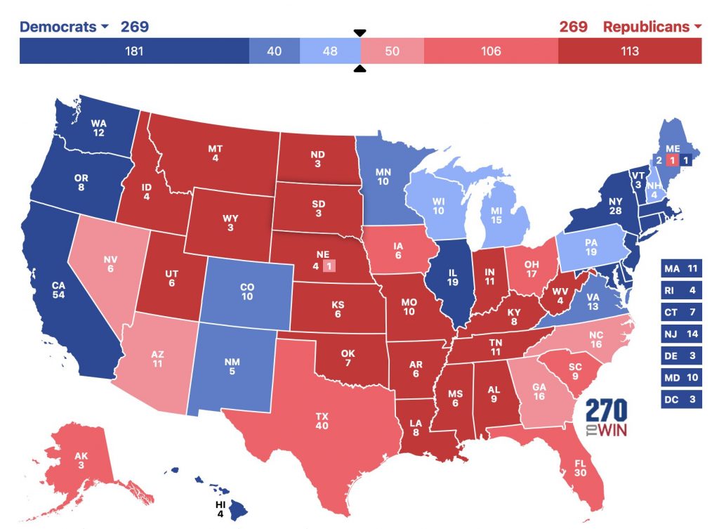 Selbst wenn sie alle drei gewinnt, ist im Ausnahmefall trotzdem noch eine Trump-Präsidentschaft möglich: Da wäre nämlich das „269 Szenario“ – also ein Gleichstand, bei dem jeder der beiden 269 Wahlmännerstimmen erhält. Möglich wäre das, wenn Harris den „Rustbelt“ gewinnt, während Trump den „Sunbelt“ mit Nevada, Arizona, Georgia und North Carolina gewinnt, plus noch den zweiten Distrikt im republikanischen Nebraska.