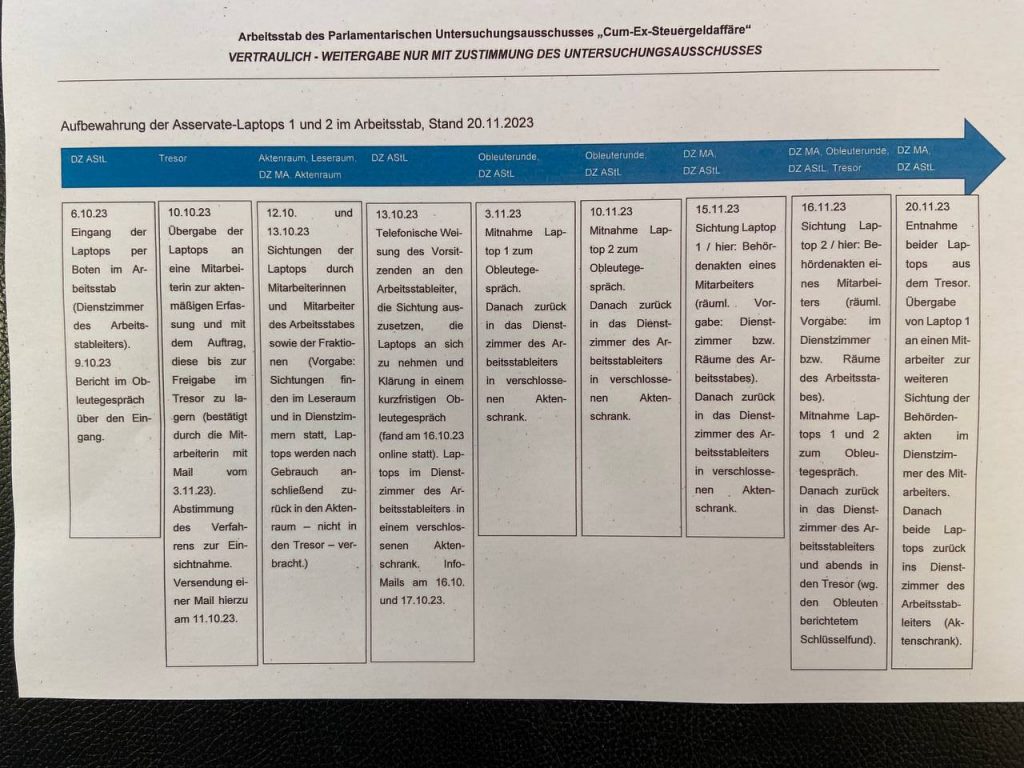Aus dem Dokument geht zudem hervor, dass der SPD-Abgeordnete und Vorsitzende des Untersuchungsausschusses Petersen, den Arbeitsstabsleiter Jänicke am 13. Oktober – also einen Monat vor dem Schlüsselfund – anwies, die Laptops „an sich zu nehmen“. Daraufhin wurden sie von einem streng gesicherten Tresor der Bürgerschaft in das ungesicherte Büro von Jänicke gebracht. Weiter geht hervor, dass die Laptops dann mehrfach durch Jänicke gesichtet worden waren – zur gleichen Zeit, wie der Vorfall mit dem Schlüsselbund. Dabei ging es um „Behördenakten eines Mitarbeiters“. Ziel war es offiziell, die Datensätze so zu bearbeiten, dass Persönlichkeitsrechte von in den Akten genannten Personen nicht verletzt werden können. Bei diesen Sichtungen wurde dann allerdings ebenfalls gegen das Vier-Augen-Prinzip verstoßen. Brisant: Bei den gesichteten Dokumenten ging es um jene Mails, die auch Olaf Scholz betreffen.