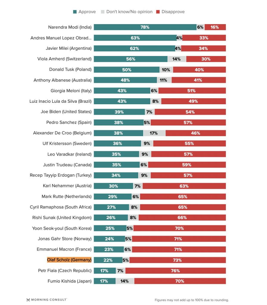 Eine kürzlich durchgeführte Analyse, basierend auf Umfragedaten des amerikanischen Unternehmens Morning Consult, welches für seine breit angelegten Online-Befragungen zu politischen Präferenzen bekannt ist, offenbart, dass Scholz mit einer Unzufriedenheitsrate von 73 Prozent auf Platz zwei nur knapp hinter dem tschechischen Premierminister Petr Fiala liegt.