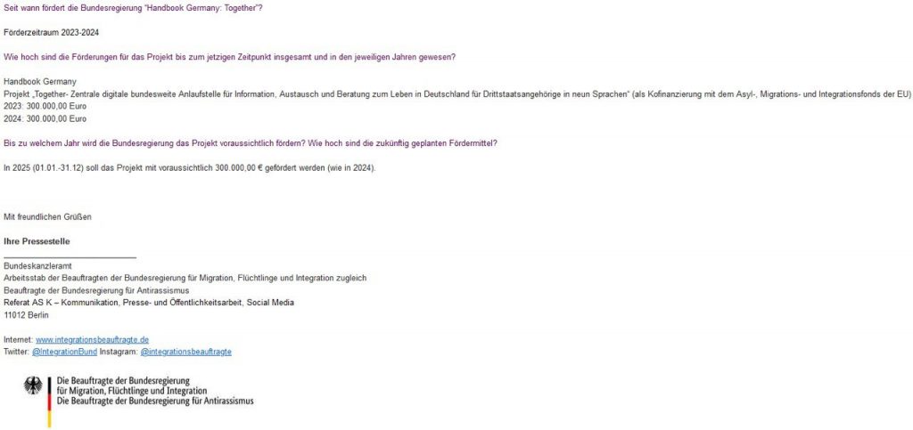 „Wozu hat man sonst einen Migranten im Team?“ SPD-Bundestagsabgeordnete Isabel Cademartori schreibt einen rassistisch anmutenden Post zu Ex-FDP-General Djir-Sarai. Anstatt sich zu entschuldigen, attestiert sie der FDP auch noch strukturellen Rassismus.Dabei unterschied die Behörde zwischen dem Projekt „Informationsplattform für Flüchtlinge” der Plattform „Handbook Germany“, das von 2016 bis Ende 2022 gefördert wurde, und dem Projekt „Handbook Germany: Together – zentrale, digitale Anlaufstelle“, das von Anfang 2023 bis Ende 2025 gefördert wird.