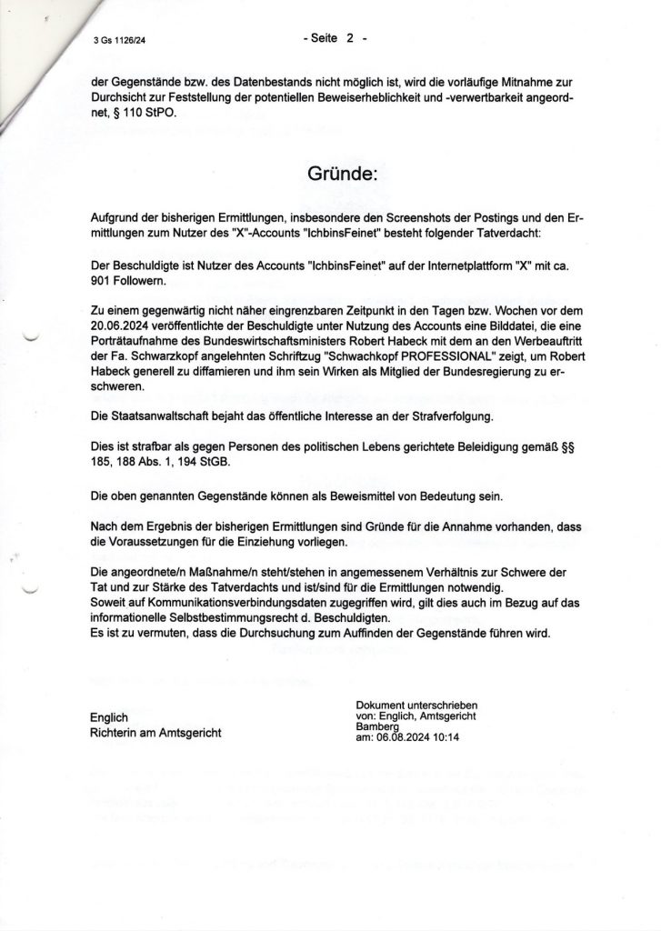 Auch wenn die Behörde dort nun den Vorwurf der Volksverhetzung untermischt, geht daraus klar hervor: Die Razzia fand wegen des Retweets eines satirischen Bilds von Habeck mit dem an den Werbeauftritt der Firma Schwarzkopf angelehnten Schriftzug „Schwachkopf PROFESSIONAL“ statt.