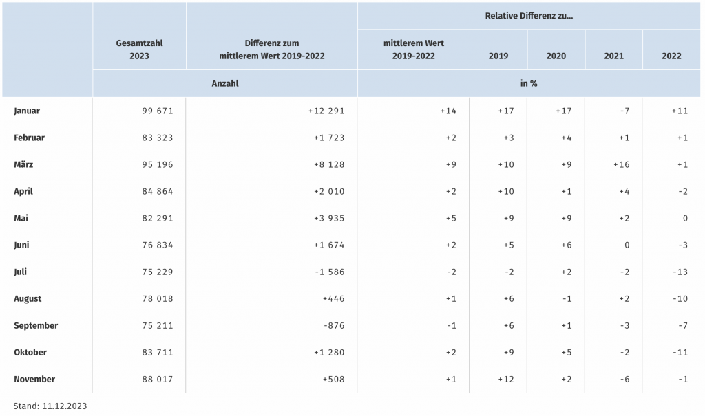 Auf den Monat bezogen starben im November zwar weniger Personen als 2022 und 2021, jedoch mehr als in den Jahren 2019 und 2020. Die Differenz zum relativen Mittelwert der Sterbezahlen aus den Jahren 2019-2022 für den November beträgt 508, das heißt, es sind im November 508 Personen mehr gestorben, als im Schnitt in den letzten Jahren in diesem Monat.