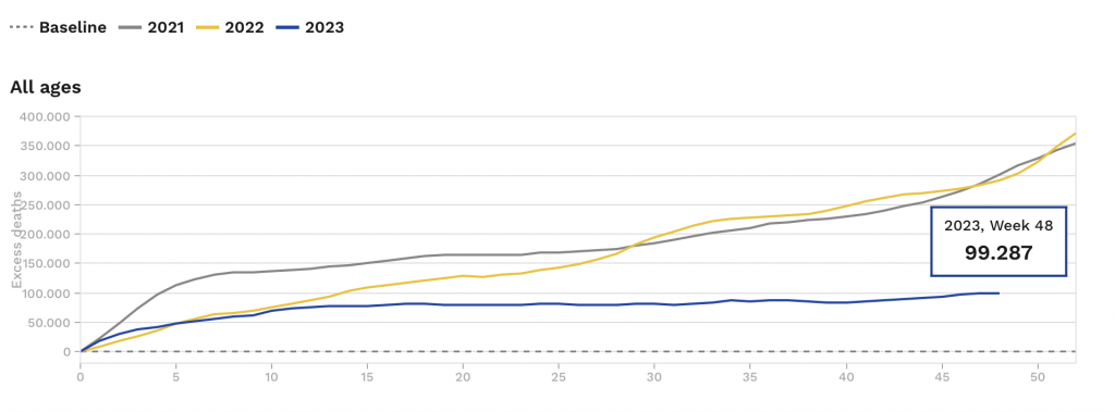 Tatsächlich deuten die Sterbezahlen des Statistischen Bundesamtes darauf hin, dass der Übersterblichkeitstrend der Pandemiejahre nach wie vor besteht, aber langsam abflaut. Das belegt auch die europaweite Übersterblichkeitsstatistik des EuroMOMO-Netzwerks. Darin sind für Deutschland im Jahr 2023 von 99.287 unerwartete Tode angegeben (Stand 48. Kalenderwoche). Zum Vergleich: 2022 erreichte die Übersterblichkeit des Netzwerkes für Deutschland einen Höchstwert von 372.360 unerwarteten Todesfällen. In 2021 waren es 354.352 Fälle.