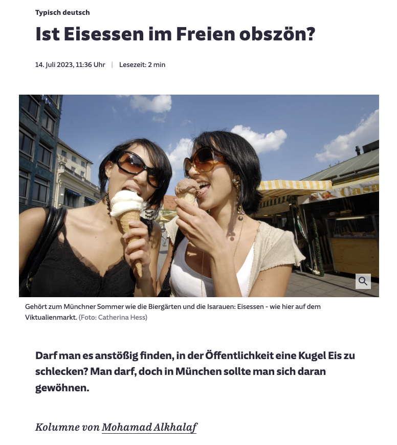 In der Kolumne „Typisch Deutsch“ in der Süddeutschen Zeitung schreibt der Autor Mohamad Alkhalaf regelmäßig über Dinge, die er seit seiner Flucht aus Syrien 2016 hier erlebt – über die Besonderheiten dieses Landes. So auch am Freitag. Doch der Artikel „Ist Eisessen im Freien obszön?“ sorgt für Aufregung. Insbesondere der Anlauftext: „Darf man es anstößig finden, in der Öffentlichkeit eine Kugel Eis zu schlecken? Man darf, doch in München sollte man sich daran gewöhnen.“