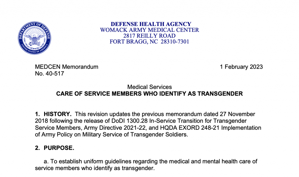 Das 34-seitige Memo der „Defense Health Agency“ für das „Womack Army Medical Center“, eine Klinik die für 160.000 Soldaten und Angehörige zuständig ist und damit die größte ihrer Art in der US-Armee, hat nach eigener Beschreibung das Ziel, das dauerhafte persönliche Wohlbefinden seiner Transgender-Militärangehörigen herzustellen – ihre psychische Gesundheit und Selbstverwirklichung zu garantieren. Dazu werden den Militärangehörigen unter anderen auch kosmetische Behandlungen angeboten. Auf Kosten des Steuerzahlers kann zum Beispiel eine Trans-Frau, also ein biologischer Mann, unter anderem Laser-Haarentfernungen oder Gesichts- und Körperkonturierung – also ein Lifting – vornehmen lassen.