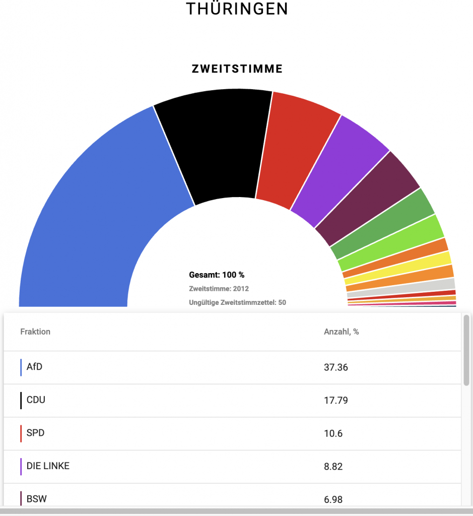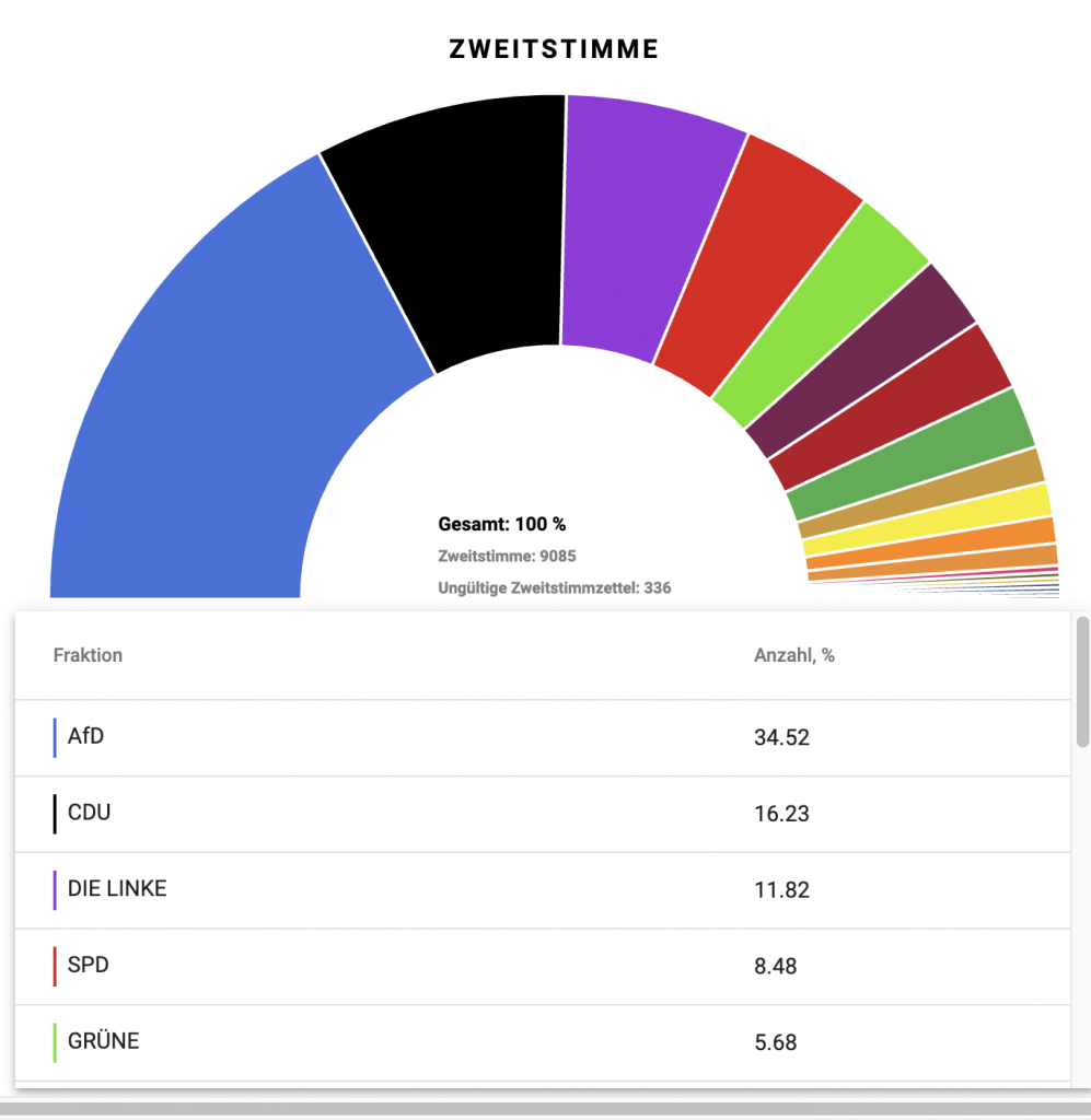 Die CDU erhielt mit 16,2 Prozent rund sechs Prozent mehr Stimmen als 2019. Danach folgt die Linke mit 11,8 Prozent (minus 0,9 Prozent) und die SPD mit 8,5 Prozent (minus 1,6 Prozent). Die Grünen stürzen vom Spitzenposten bei der Landtagswahl 2019 (27,2 Prozent) auf einen der letzten Plätze. Sie erreichen nur noch 5,7 Prozent – ein Verlust von 21,5 Prozent in fünf Jahren. Das erstmalig teilnehmende Bündnis Sahra Wagenknecht kam auf 4,8 Prozent der Stimmen.