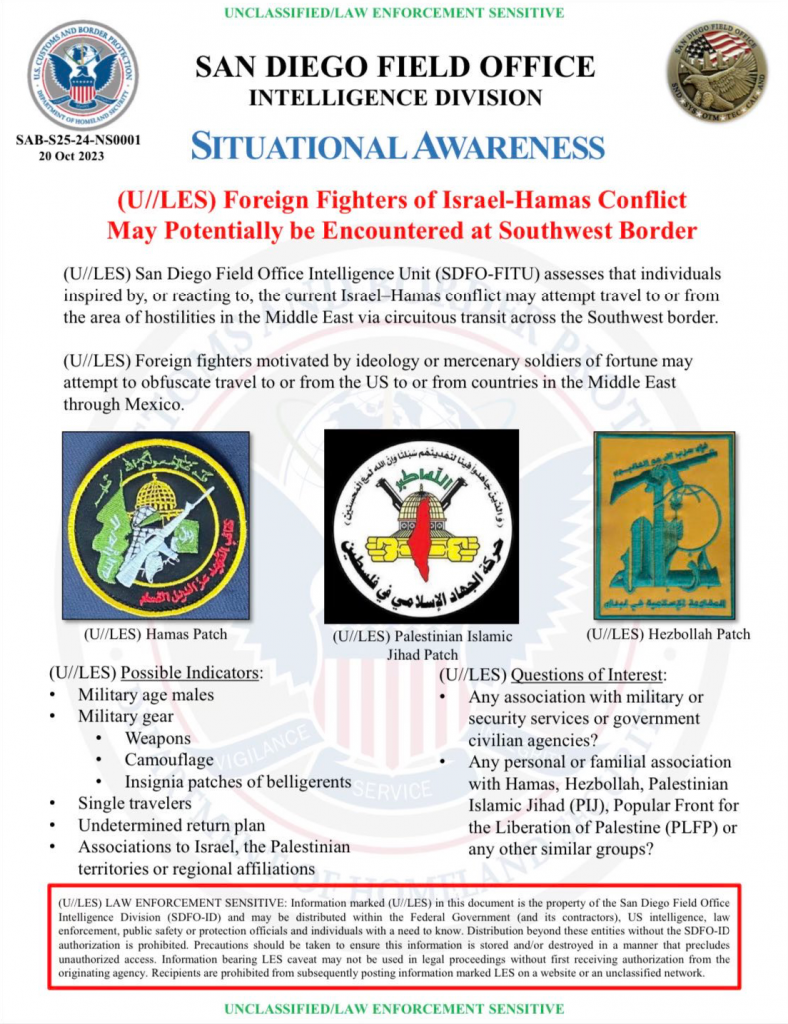 Unter dem Titel „Ausländische Kämpfer des Israel-Hamas-Konflikts könnten potenziell an der Südwestgrenze angetroffen werden“ beschreibt die Behörde, dass man davon ausgehe, dass „Personen, die vom aktuellen Israel-Hamas-Konflikt inspiriert sind oder darauf reagieren könnten, über Umwege über die Südwestgrenze in oder aus dem Konfliktgebiet im Nahen Osten zu reisen.“