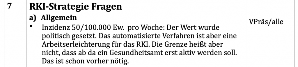 Eine zweite interessante Aussage des Ergebnisprotokolls vom 9. Mai bezieht sich auf die festgesetzte Sieben-Tage-Inzidenz von 50 Infektionen auf 100.000 Einwohner. Wenn dieser Wert überschritten wurde, hieß es Einschränkungen. Geschäfte mussten schließen, Aktivitäten eingestellt werden. In dem Protokoll heißt es: „Der Wert wurde politisch gesetzt“. Dieser Umstand ist zwar hinlänglich bekannt, verdeutlicht aber noch einmal schwarz auf weiß, dass etwaige Maßnahmen nicht auf wissenschaftlichen Erkenntnissen beruhten.