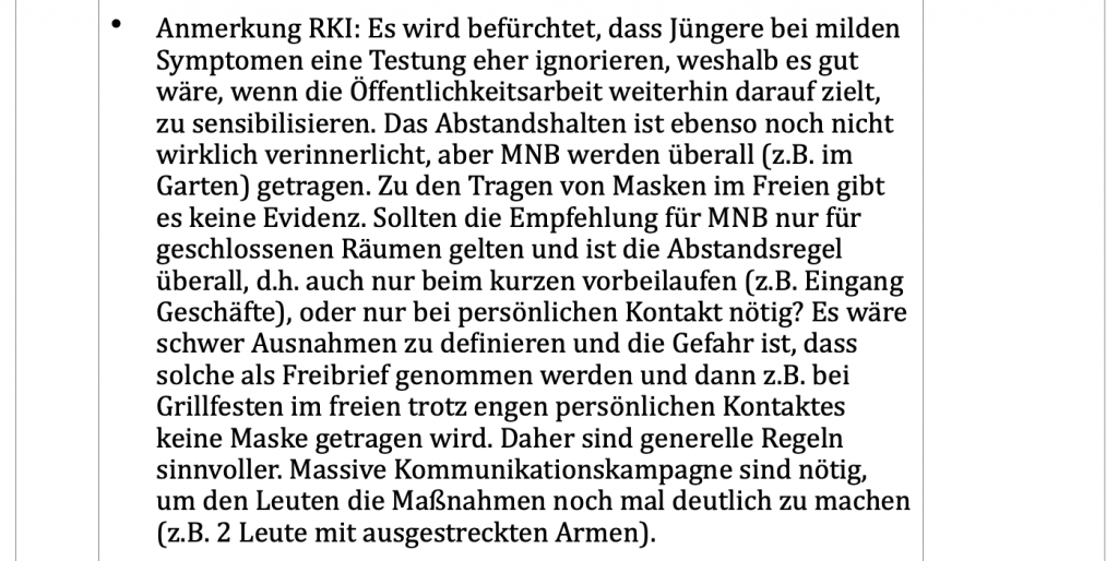 Entweder wollte das RKI nicht zugeben, dass man den Speicherort des Dokuments wegen fehlerhafter Sortierung nicht mehr lokalisieren konnte oder das Protokoll zurückhalten. Ein Blick in das betreffende Schreiben offenbart, dass dort durchaus brisante Inhalte vorhanden sind. So wird beispielsweise bei einer Diskussion über das Tragen einer Mund-Nasen-Bedeckung festgehalten, „zu den (sic!) Tragen von Masken im Freien gibt es keine Evidenz“.