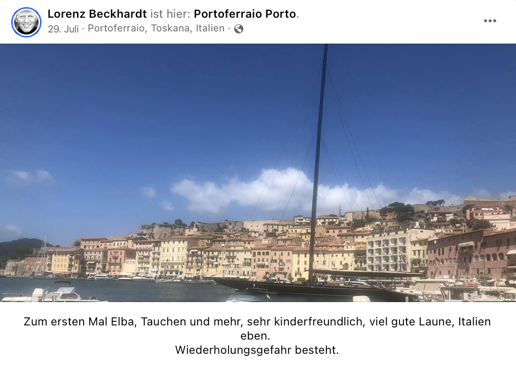 Der Ausflug nach Ägypten war außerdem nicht Lorenz erster Ausflug in diesem Jahr – erst im Juli war der Mann, der das Tauchen liebt, in Portoferraio Porto in Italien. Beckhardt schreibt: „Wiederholungsgefahr besteht“.