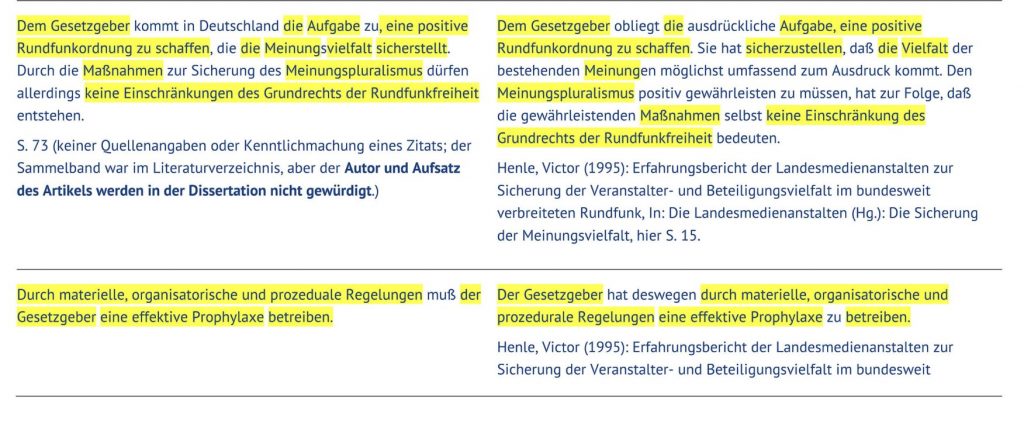 Als Beispiel für diese behauptete „Plagiatstechnik“ von Föderl-Schmid zieht Weber eine Seite der Arbeit heran, die inhaltlich fast vollständig auf Plagiaten basiert, teils wortwörtlich. Dabei kann es sich auch um keine Zufälle handeln. So schreibt Föder-Schmid etwa ohne Quellenangabe den Satz: „Durch materielle, organisatorische und prozeduale Regelungen muß der Gesetzgeber eine effektive Prophylaxe betreiben. Dieser Satz findet sich wörtlich in einer Arbeit von Victor Henle mit lediglich mit einer minimalen sprachlichen Abwandlung („haben“ wurde durch „,müssen“ ersetzt).