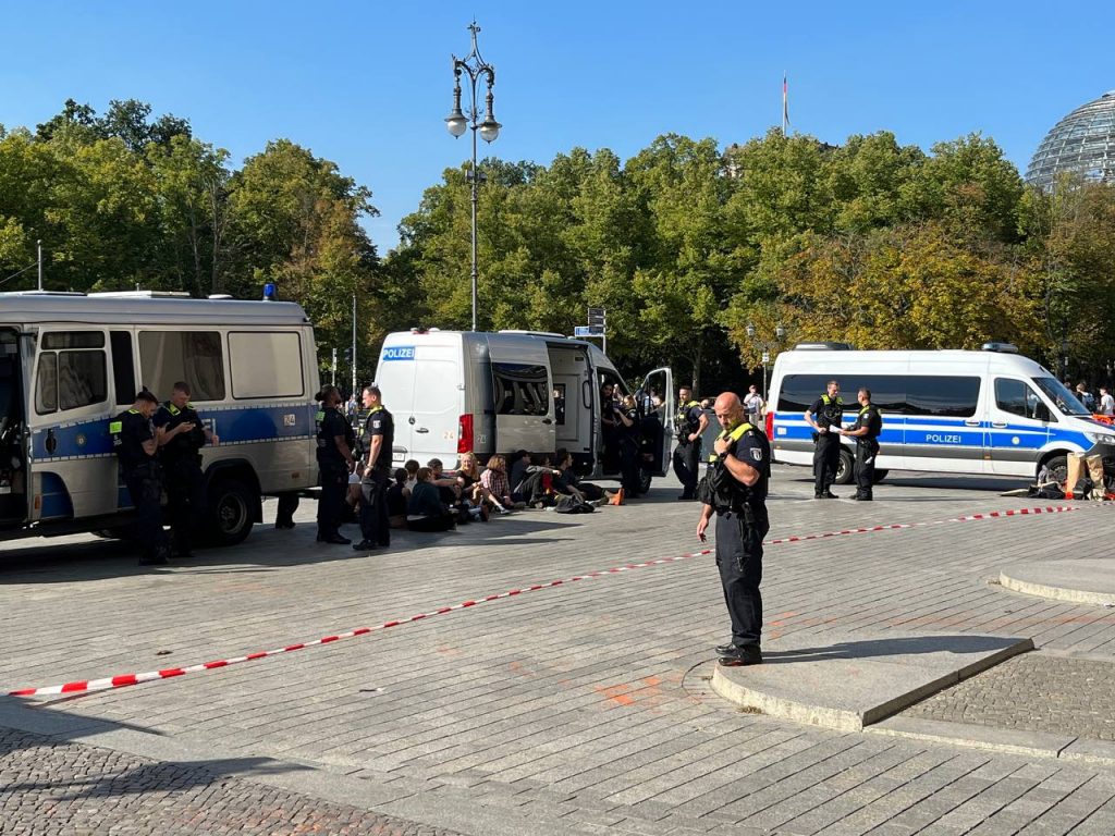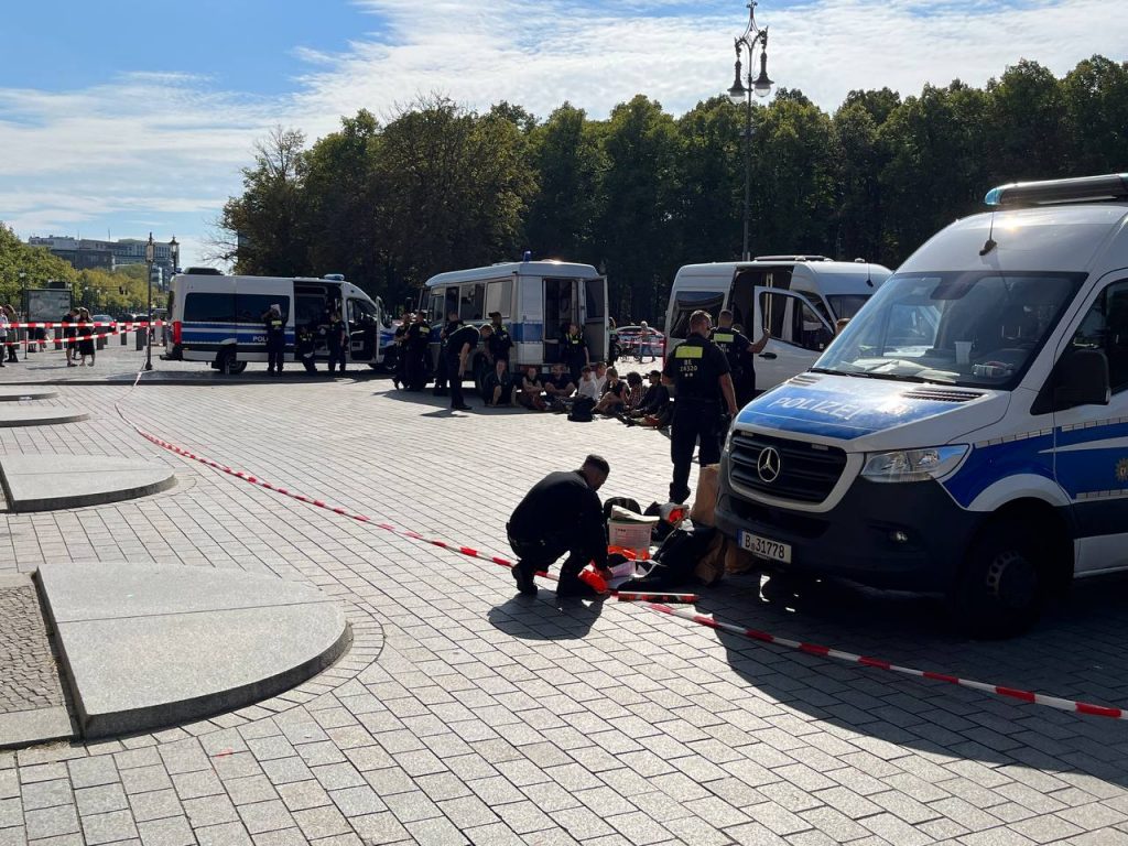 Ein Polizeisprecher gab an, dass etwa 40 Einsatzkräfte vor Ort waren. Es kam zu insgesamt 14 Festnahmen. Die Polizei ermittelt nun wegen gemeinschädlicher Sachbeschädigung, wie ein Sprecher erklärte. Die Polizei sperrte den Bereich rund um das Brandenburger Tor großflächig ab. Passanten äußerten sich der dpa zufolge ganz überwiegend ablehnend gegenüber dieser Aktion.