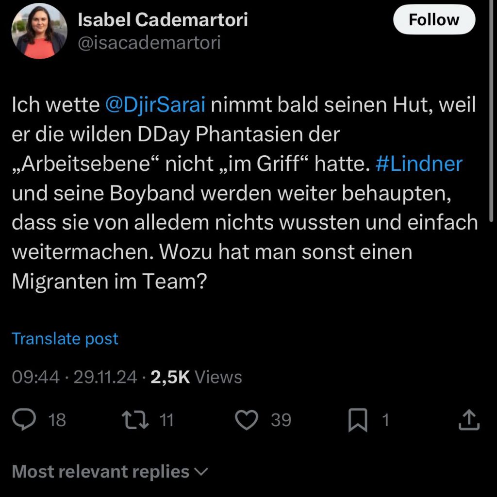 Als sich medial herumzusprechen beginnt, dass der FDP-Generalsekretär über die Kommunikation rund um ein Anti-Ampel-Strategiepapier fallen könnte, wagt Cademartori eine „Wette“: Djir-Sarai werde abgesägt werden. „Lindner und seine Boyband werden weiter behaupten, dass sie von alledem nichts wussten“ – Djir-Sarai sei ein Bauernopfer. Denn: „Wozu hat man sonst einen Migranten im Team?“